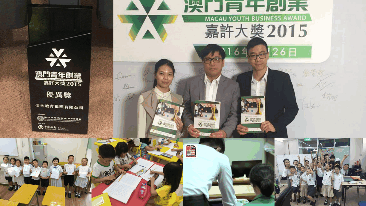 很高興儒林教育集團能夠從近百企業中挑選出來攞到這個澳門2015年青年創業嘉許大獎—優異奬..! 儒林教育集團自2013 年中成立,為全澳首個以補習社直營+加盟模式營運的教育機構,經理兩年發展,現時旗下有15間直營及加盟補習教育中心,更圍繞主要業務延伸出飲食管 理、翻譯服務、升學移民及文化出版。儒林教育提供課程及服務涵蓋中小幼教育至成人專業進修,各地區主打不同特色課程,建立多元及 差異性的市場區隔。未來致力向綜合增長型企業方向發展,為本澳教育事業貢獻。
